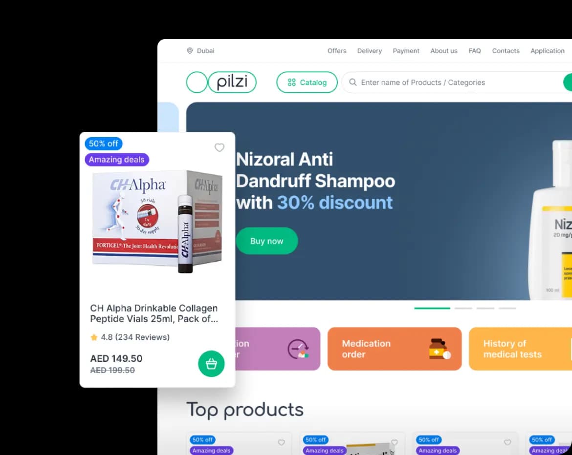 Direct medication orders with delivery, access to top diagnostic labs and clinics, plus user reviews – all in one app